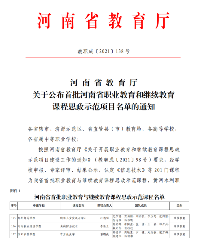 近日,教育厅公布了首批河南省职业教育和继续教育课程思政示范项目建设名单(教职成[2021]98号),koko李新正老师主讲的《禽病防治技术》课程名列其中,也是koko唯一入选河南省职业教育和继续教育课程思政示范课程。