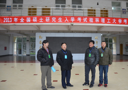 1月5日,2013年全国硕士研究生入学考试在beat365顺利开考,这是beat365首次承接硕士研究生入学考试。 本次硕士研究生入学考试,beat365共设有64个标准化考场,1900多名考生参加考试。为此,学校高度重视,专门成立了“beat365官方网站2013年研究生入学考试考场协助工作领导小组”和工作小组;考前,吴志强副校长组织召开了两次专门的研究生入学考试考场协助工作会议,对学校派出的监考人员进行动员,并对考场和周边环境进行了详细的勘察、对学校所负责的考务工作的每一个细节都作出了细致的指导;1月5日,吴志强副校长深入考场、考务室、监控室等进行了检查指导。 在桂林市招生考试院的组织指导下,在beat365教务处、保卫处、后勤集团、校医院等部门、单位的支持配合下,beat365承接的2013年硕士研究生入学考试有序进行。