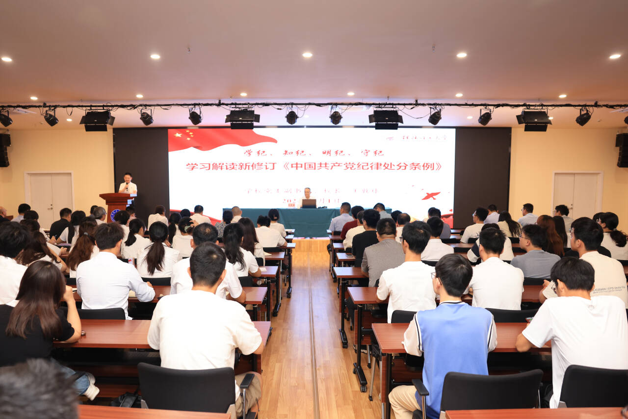 7月1日,学校党委副书记、校长王敦球为师生党员代表讲授党纪学习教育纪律党课,强调要认真学习《中国共产党纪律处分条例》,推动党纪学习教育走深走实,在全校上下营造学纪、知纪、明纪、守纪的浓厚氛围。