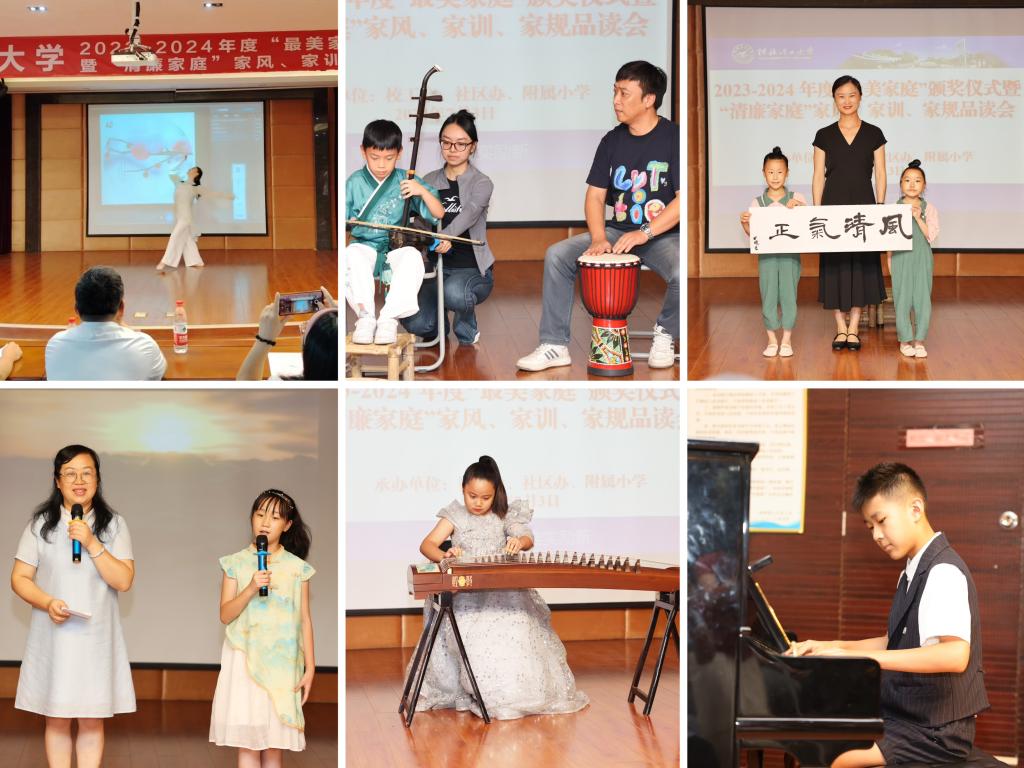 为深入贯彻落实习近平总书记关于“注重家庭、注重家教、注重家风”重要指示精神,充分发挥家风、家训、家规在“清廉家庭”建设中的重要作用,7月3日,学校2023-2024 年度“最美家庭”颁奖仪式暨“清廉家庭”家风、家训、家规品读会在屏风校区举行。学校党委副书记、工会主席吴志强出席活动。“最美家庭”代表、附属小学学生及家长代表参加活动。