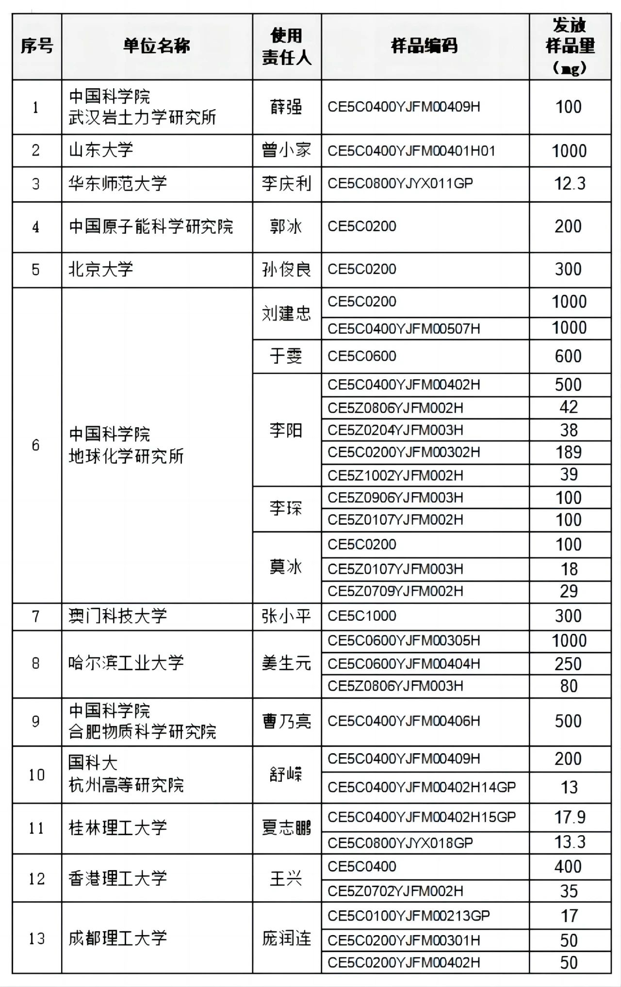 第七批嫦娥五号月球科研样品发放名单