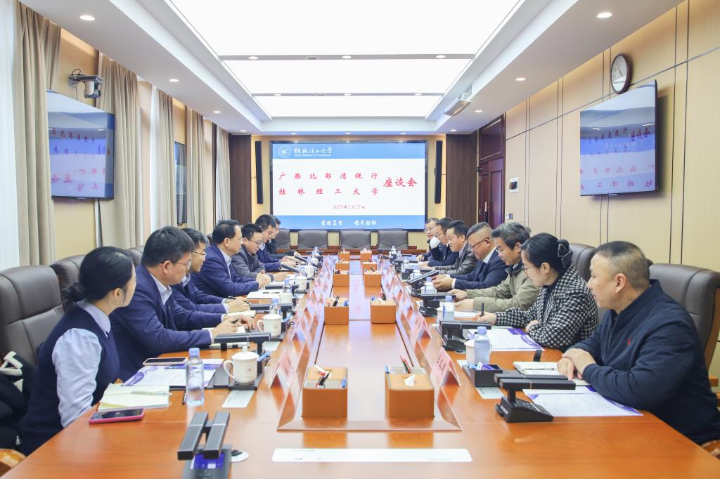 2月27日上午,广西北部湾银行总行党委副书记、职工董事、工会主席谢兆东,桂林分行党委书记、行长刘跃,总行直属党委副书记、党群工作党支部书记、党群工作部(统战部)部长陆治国一行7人来访beat365。校领导邓军、韦学敏、曾繁荣在屏风校区办公楼第一会议室热情接待了来访客人。