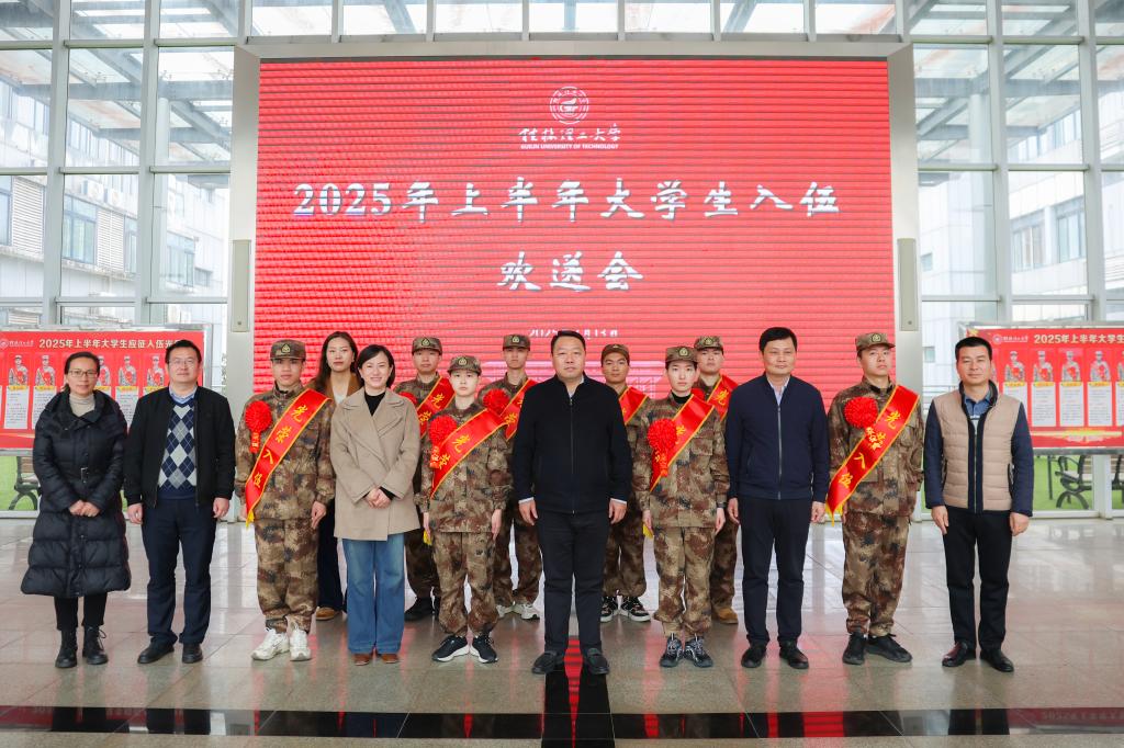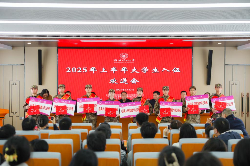 地球科学学院辅导员林丽专老师作为辅导员代表发言。她简要介绍了学院落实上级和学校有关要求部署,加强组织领导,采取有力措施,做好大学生征兵工作的经验做法。物理与电子信息工程学院李家耀同学作为入伍大学生代表发言。他表示,将牢记桂工校训、服从命令、听党指挥,严格要求自己,努力成为一名合格的军人。