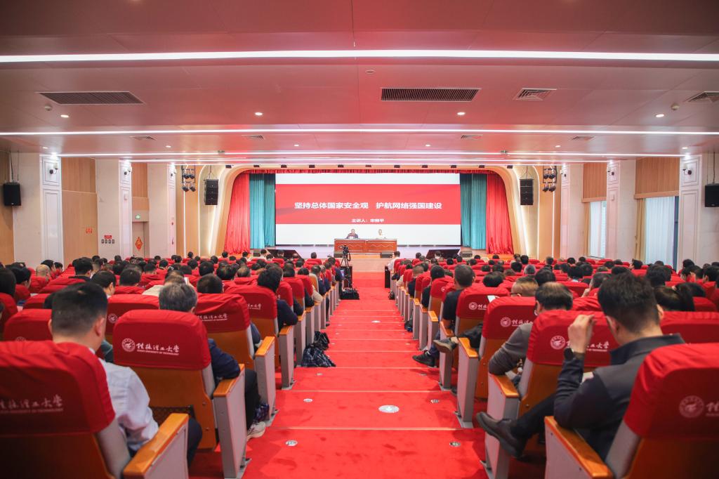 王敦球在主持中强调,全校师生要认真贯彻落实总体国家安全观,主动融入国家网络强国战略,以扎实科研与创新能力服务国家安全大局,培养担当民族复兴大任的时代新人。