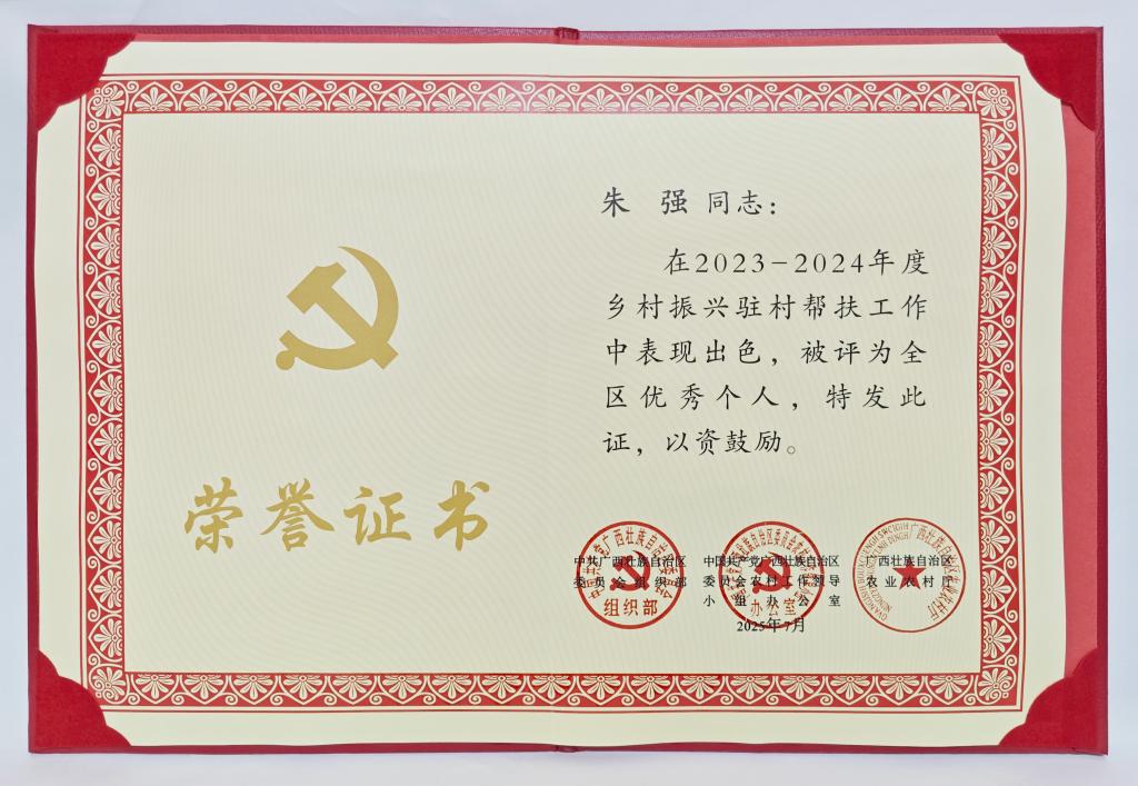 近日,自治区党委组织部、自治区党委农办、自治区农业农村厅下发《关于表彰全区2023—2024年度驻村工作队先进集体和优秀个人的决定》,beat365党委组织部(乡村振兴办公室)荣获“先进后盾单位”,原派驻灌阳县黄关镇东阳村第一书记朱强获评“优秀驻村第一书记”。