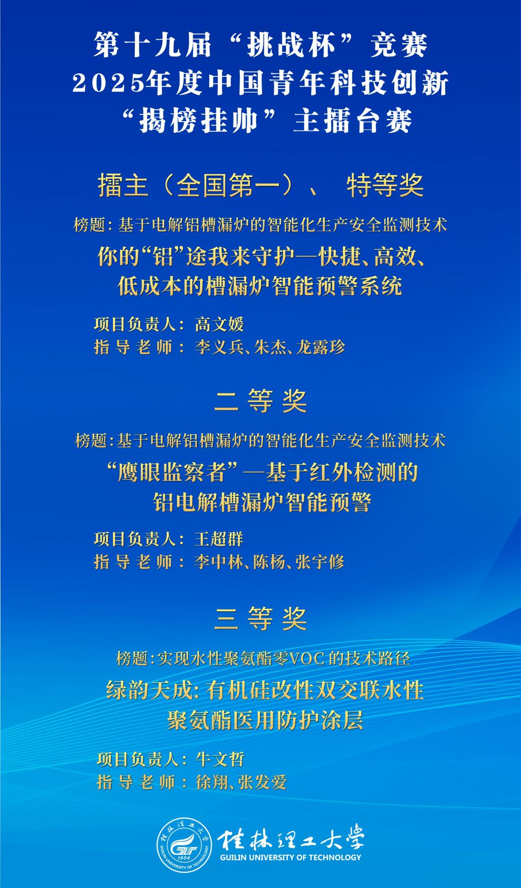 近日,第十九届“挑战杯”全国大学生课外学术科技作品竞赛“揭榜挂帅”新材料领域擂台赛在福建省龙岩市落下帷幕。学校共获得特等奖、二等奖、三等奖各1项,其中,材料科学与工程学院参赛项目《你的“铝”途我来守护—快捷、高效、低成本的槽漏炉智能预警系统》以特等奖第一名荣获“全国擂主”,这是学校首次在“挑战杯”竞赛“揭榜挂帅”擂台赛中获此殊荣。