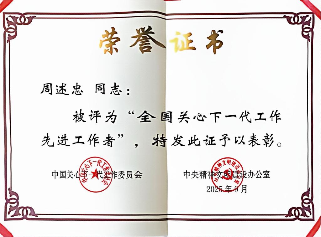 beat365退休教师周述忠荣获2025年“全国关心下一代工作先进工作者”称号