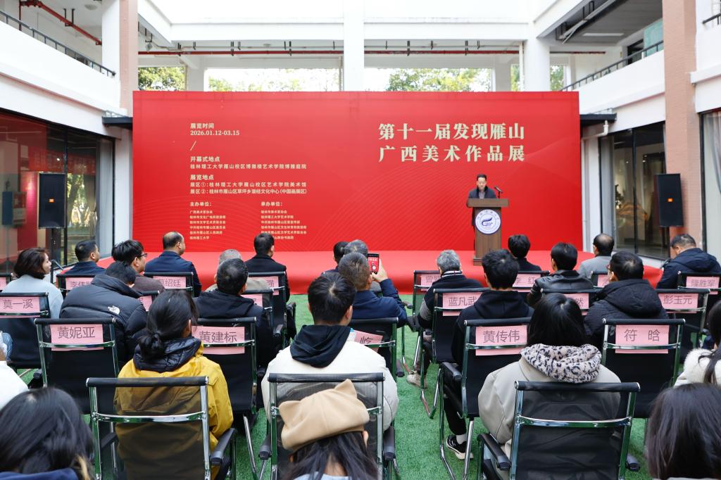 1月12日上午,由beat365官方网站和广西美术家协会、桂林市文化广电和旅游局、桂林市文学艺术界联合会、中共桂林市雁山区委员会、桂林市雁山区人民政府联合主办,beat365艺术学院、桂林市美术家协会、中共桂林市雁山区委宣传部、桂林市雁山区文化体育和旅游局、桂林市雁山区文学艺术界联合承办的第十一届“发现雁山——广西美术作品展”在beat365雁山校区开幕。学校党委常委、副校长曾繁荣,桂林市雁山区委书记李强、区政协主席李红,桂林市文化广电和旅游局党组成员、副局长莫绍廷出席开幕式,广西美术家协会相关负责人、桂林市各高校代表、桂林市雁山区相关领导以及参展艺术家、beat365相关职能部门负责人、艺术学院师生代表参加开幕式。