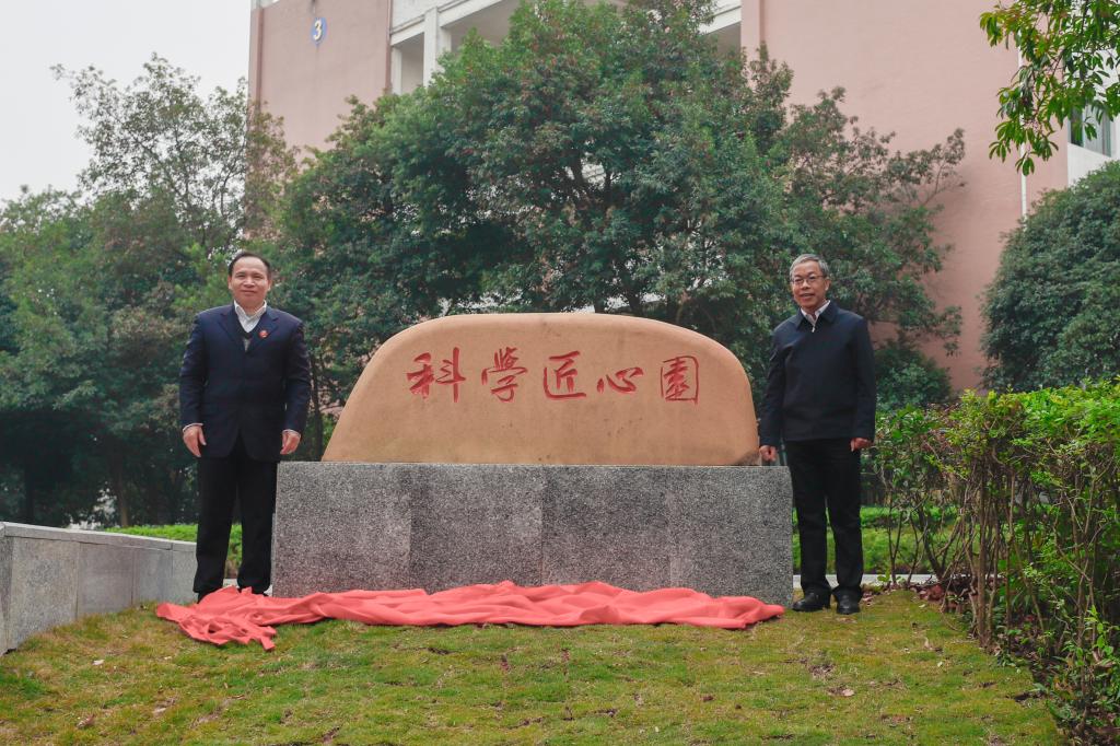 学校副校长周国清,党委常委、副校长黎贞崇为科学匠心园揭牌