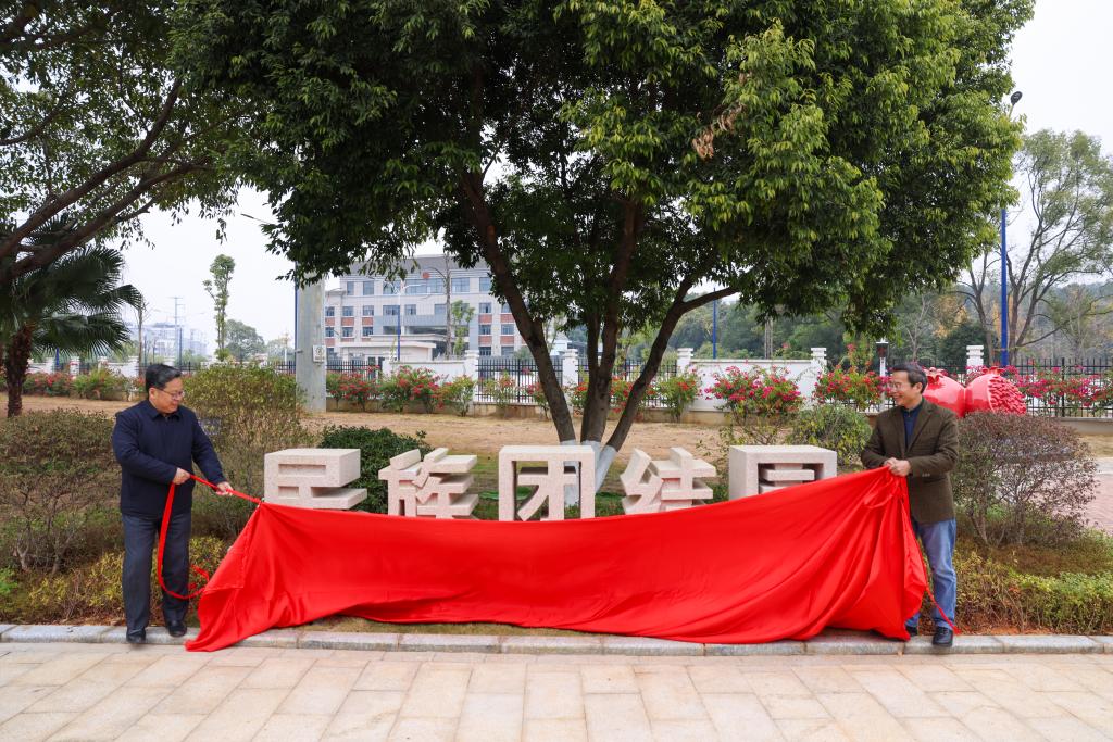 学校党委副书记吴志强,自治区纪委监委驻校纪检监察组组长,学校党委常委、纪委书记韦学敏为民族团结园揭牌