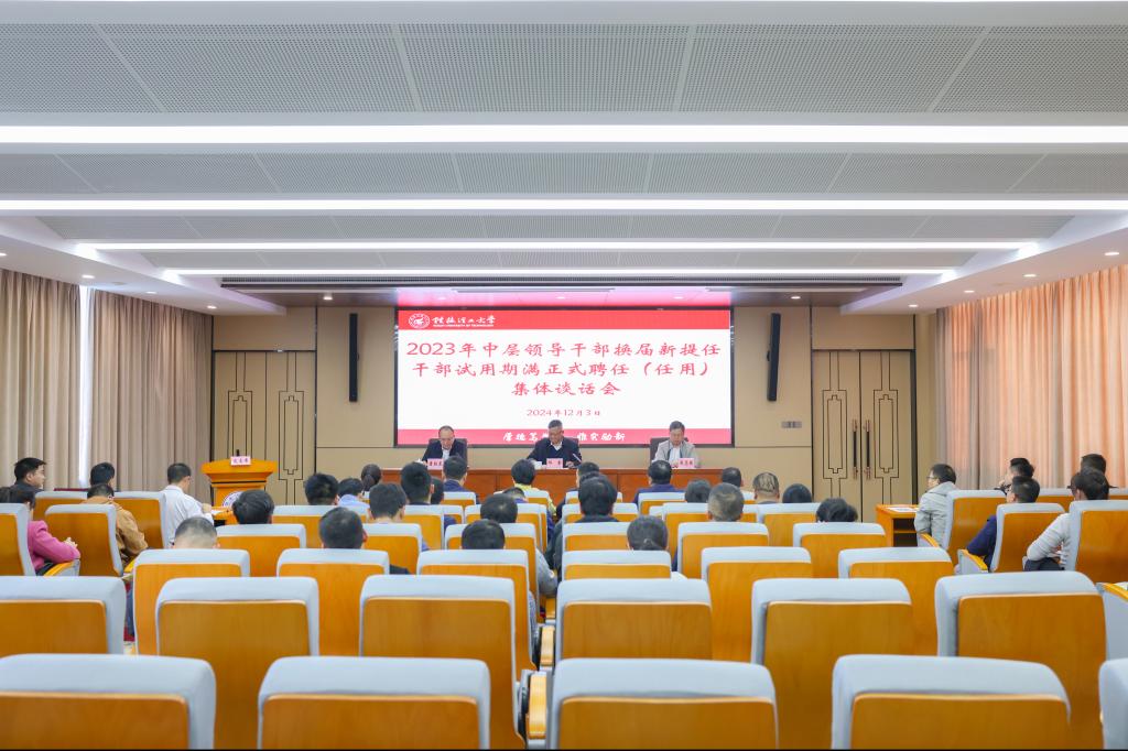 根据干部任用有关规定和组织程序,12月3日下午,学校在雁山校区行知楼报告厅召开2023年中层领导干部换届新提任干部试用期满正式聘任(任用)集体谈话会。会议深入学习贯彻党的二十大和二十届二中、三中全会精神,勉励全体试用期满正式聘任(任用)干部践行好新时代好干部标准,进一步统一思想认识,提高政治站位,牢记使命任务,强化责任担当,全力开创工作新局面。