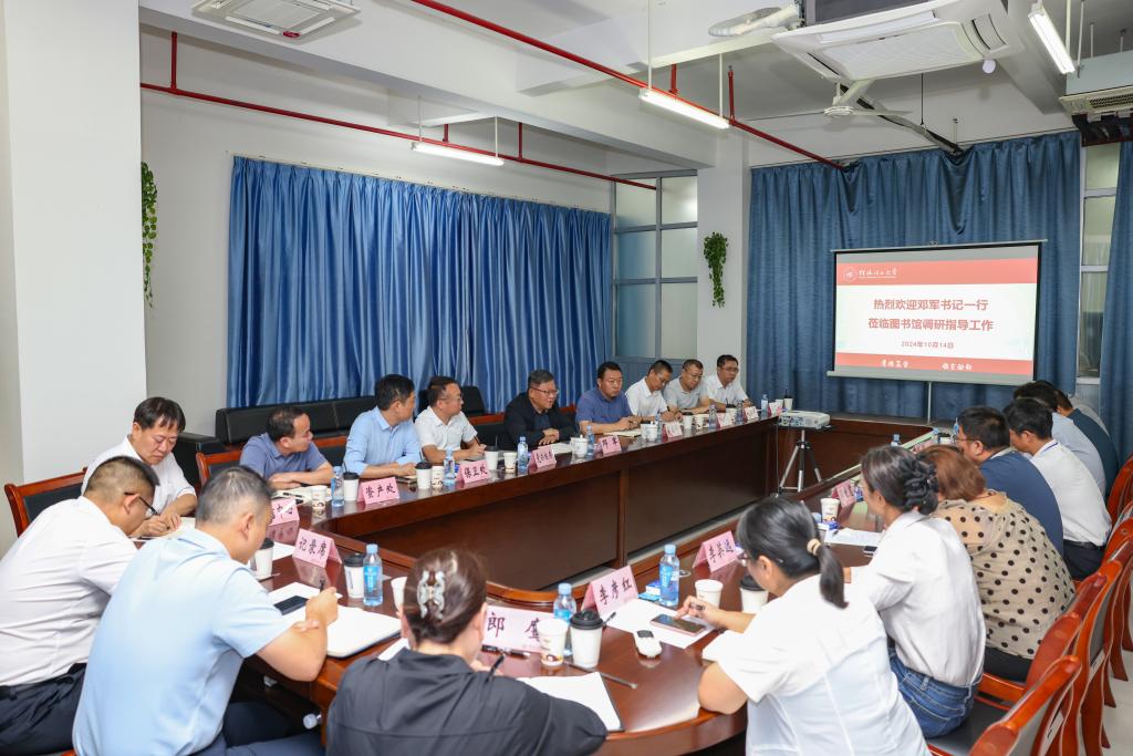 10月14日,学校党委书记邓军到图书馆调研。学校党委常委、副校长罗盛锋,校长助理张成龙陪同调研。