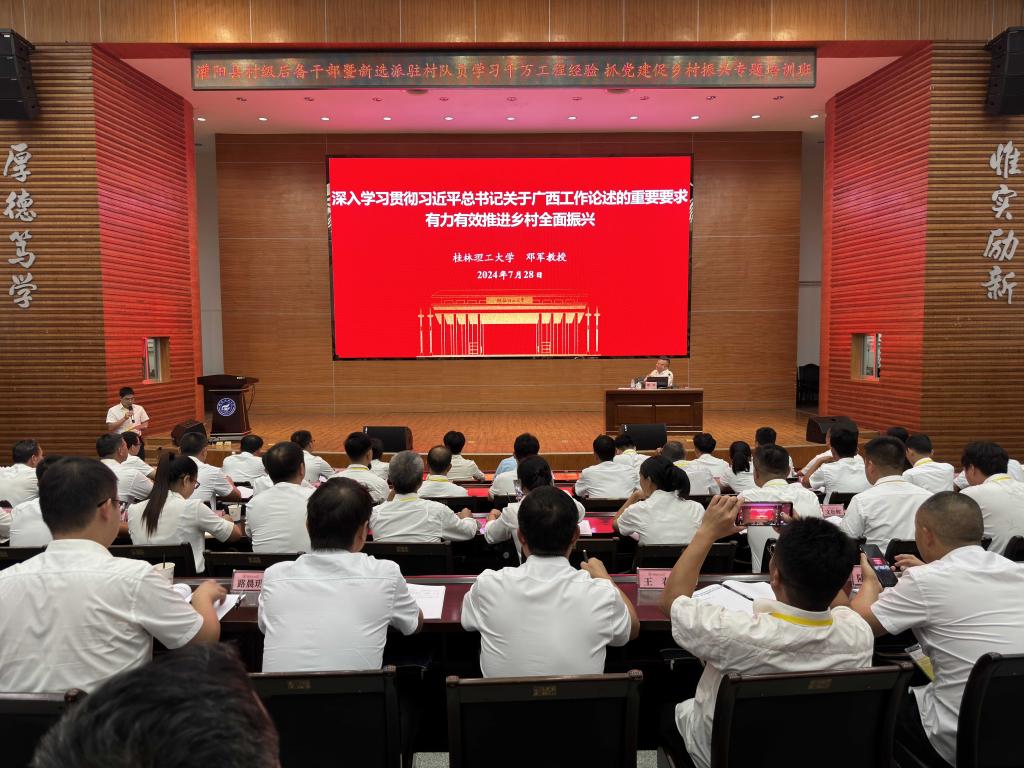为深入学习贯彻党的二十大和二十届三中全会精神,扎实推动学校助力灌阳县乡村振兴“五个一百”专项计划落地落细,7月28日至31日,由学校资助举办的“灌阳县村级后备干部暨新选派驻村队员‘学习千万工程经验 抓党建促乡村振兴’专题培训班”在屏风校区举行,来自灌阳县139名村级后备干部和新选派驻村队员参加培训。学校党委常委、副校长罗盛锋出席开班式并致辞。