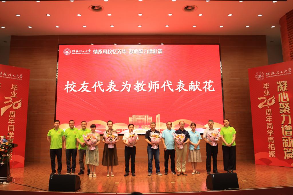 化探专业94届校友、大庆油田采油五厂油田部主任张大伟,土木工程专业04届校友、土木工程与智慧城市行业校友会执行会长、深圳市深勘工程咨询有限公司总经理贾海鹏分别作分享发言,深情回顾了自己在桂工的求学岁月,表达对母校的深深眷恋以及对授业恩师的感恩之情。校友代表向教师代表敬献了鲜花。