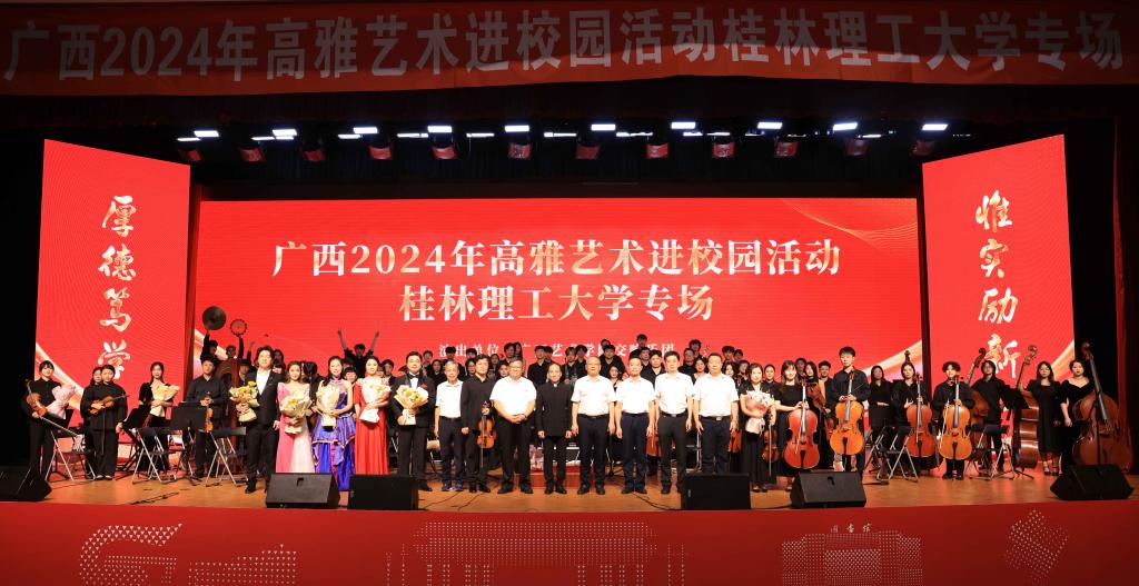 为进一步丰富校园文化,提高师生艺术修养,6月7日,由自治区教育厅主办、beat365承办的2024年高雅艺术进校园活动广西艺术学院交响乐团专场演出在beat365屏风校区体育馆精彩上演,校领导邓军、王敦球、韦学敏、王磊、黎贞崇、罗盛锋,与现场近1200名师生代表欢聚一堂,共同聆听这场音乐盛宴。