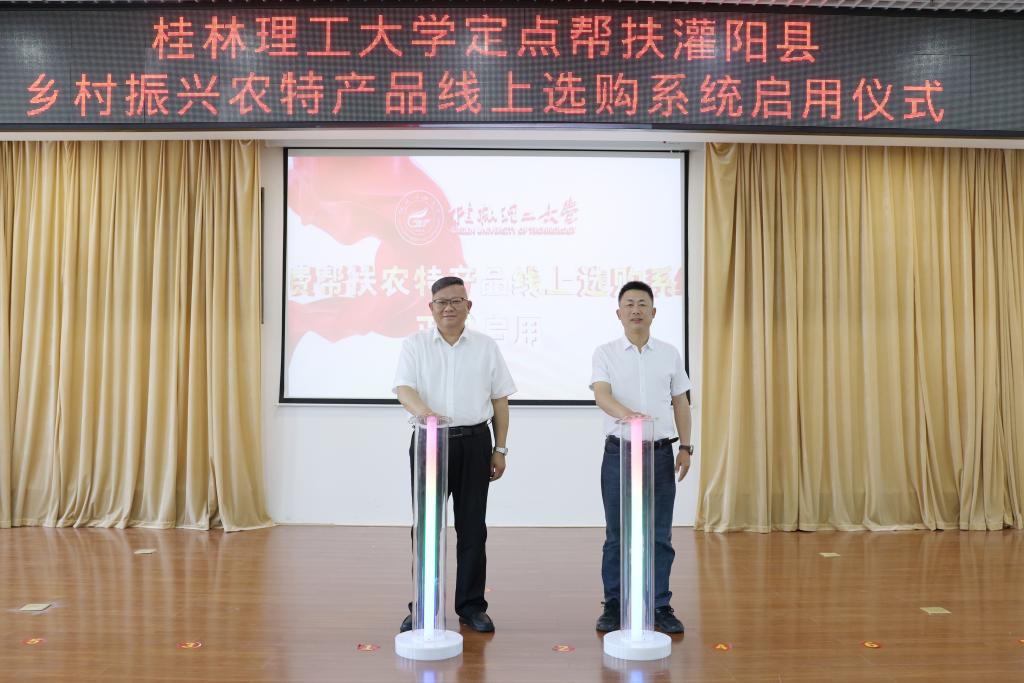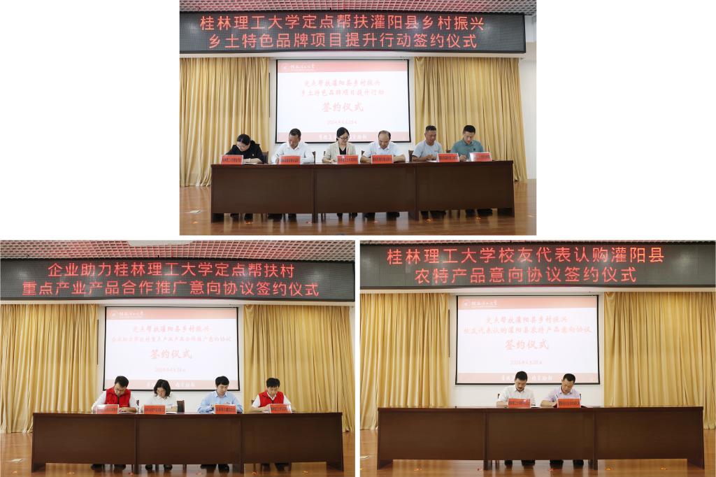 会议期间,还举行了灌阳县乡土特色品牌项目提升行动签约仪式,桂林万禾农产品有限公司、桂林银行灌阳支行助力帮扶村重点产业产品合作推广意向协议签约仪式,校友代表认购灌阳县农特产品意向协议签约仪式以及学校乡村振兴农特产品线上选购系统启用仪式。