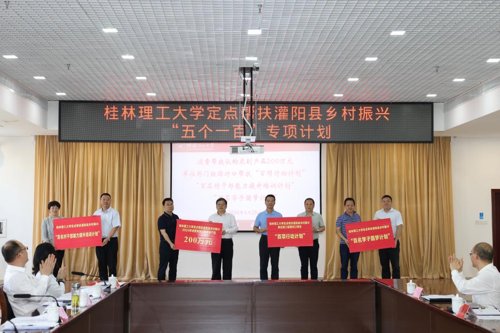 会议宣布,2024年学校定点帮扶灌阳县乡村振兴“五个一百”专项计划启动。邓军代表学校向灌阳县捐赠重点产业帮扶资金100万元,吴志强代表学校启动认购灌阳县农副产品200万元,韦学敏代表学校启动组团对口帮扶“百项行动计划”,罗盛锋代表学校启动“百名村干部能力提升培训计划”,曾繁荣代表学校启动助力灌阳县“百名学子圆梦计划”。