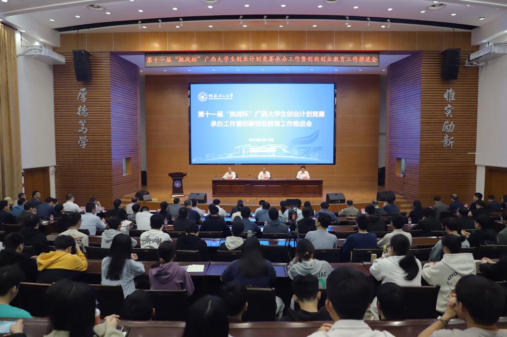 为推进承办第十一届“挑战杯”广西大学生创业计划竞赛广西区选拔赛各项筹备工作以及beat365参赛组织工作,4月18日上午,beat365在屏风校区图书馆报告厅召开第十一届“挑战杯”广西大学生创业计划竞赛承办工作暨创新创业教育工作推进会。学校党委副书记、校长王敦球出席会议并讲话,党委常委、副校长王磊主持会议,党委常委、副校长黎贞崇出席会议。党办校办、学工部(处)、本科生院、研究生院、科学技术研究院、校团委、创新创业学院相关负责人,各学院分管创新创业教育工作的副院长、分管学生工作的副书记、团委书记,指导教师代表、参赛学生代表参加会议。南宁分校分管领导、负责部门人员线上参会。