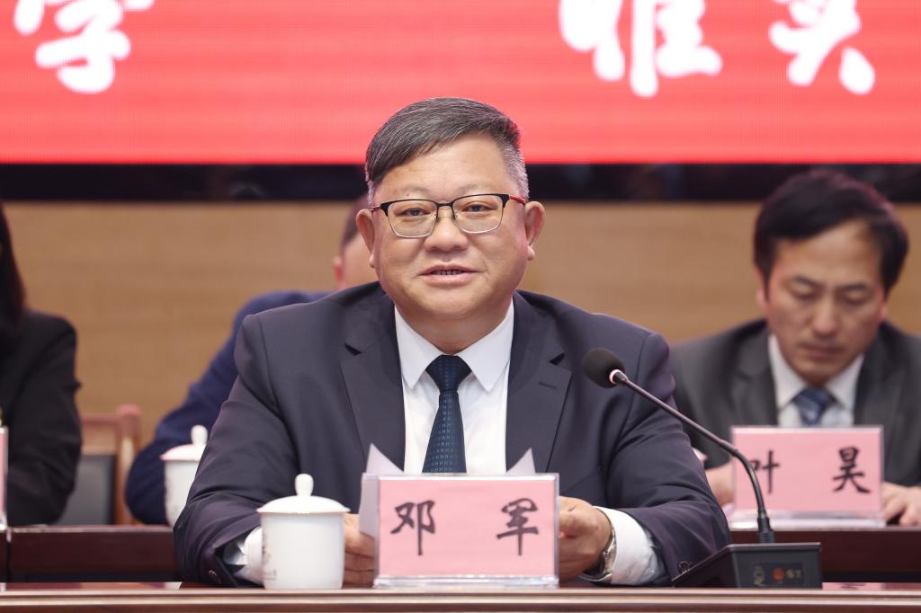 邓军号召全校上下要更加紧密地团结在以习近平同志为核心的党中央周围,以习近平新时代中国特色社会主义思想为指导,坚定高举旗帜的信念、保持推动发展的定力、涵养一心为民的情怀、铆足激情拼搏的劲头,心往一处想、劲往一处使,对标一流干、敢抓机遇干、甩开膀子干、加压奋进干、一茬接着一茬干,一项一项突破、一件一件干成,把科学谋划的“蓝图”变成无限美好的“实景”,奋力开创高水平理工大学建设崭新局面。