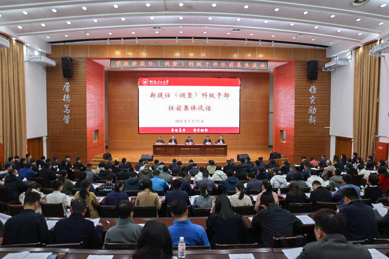 3月22日上午,学校在屏风校区图书馆报告厅举行新提任(调整)科级干部任前集体谈话会。会议以习近平新时代中国特色社会主义思想和党的二十大精神为指导,坚定不移贯彻落实习近平总书记关于加强干部队伍建设的重要论述,为提任和调整岗位的科级干部加油鼓劲并进行廉政提醒,教育引导同志们提高政治站位,提升思想认识,忠诚履职尽责,勇于开拓创新,在新起点新征程上担当新使命、实现新作为、开创新局面,为建设高水平理工大学和新时代壮美广西作出新的更大贡献。