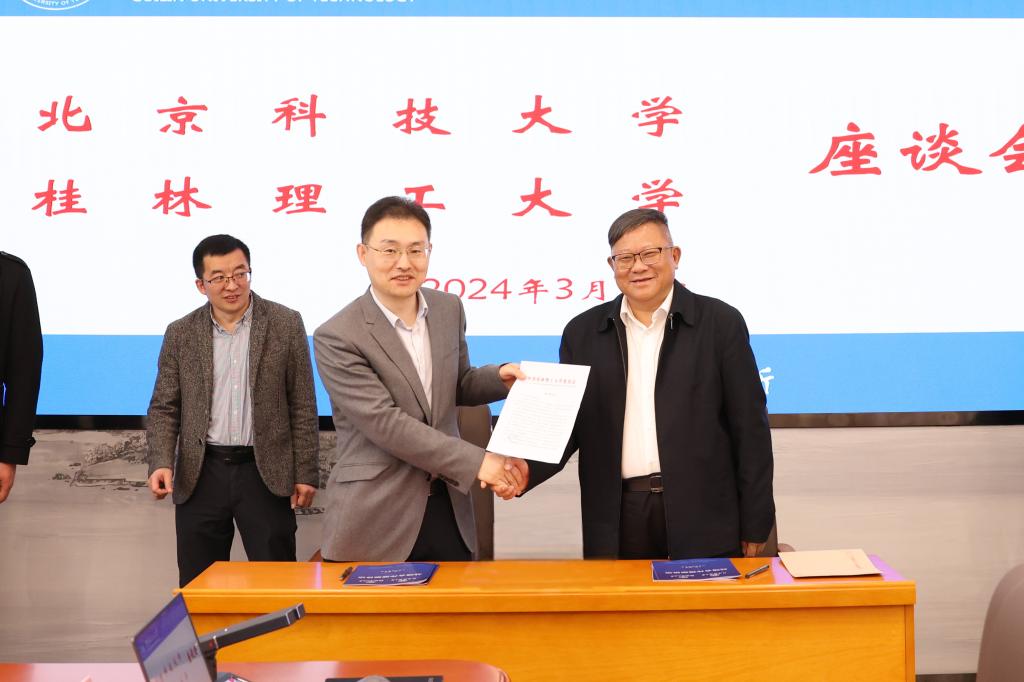 邓军代表学校向北京科技大学递交了感谢信,于成文代表北京科技大学接受感谢信。黎贞崇、于成文分别代表双方签署战略合作协议,与会领导共同见证签约。