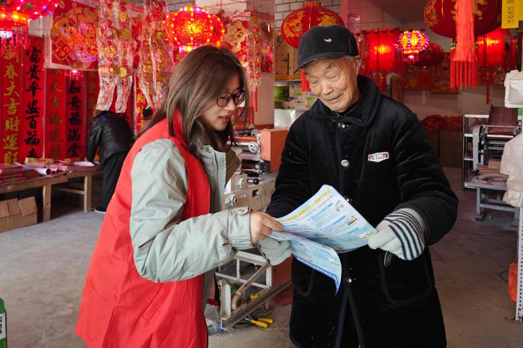周顺雨同学为社区居民进行普法宣传,提醒居民防范电信网络诈骗