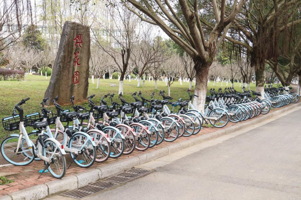 校园内摆放整齐的共享单车
