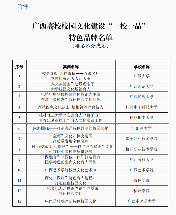 近日,自治区党委教育工委公布广西高校校园文化建设“一校一品”特色品牌名单,beat365申报的案例《“实践育人‘百千万’,青春筑梦在桂工”育人文化实践工程》成功入选。