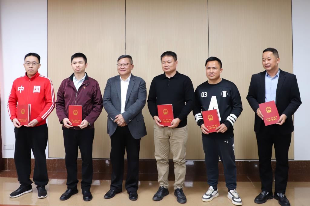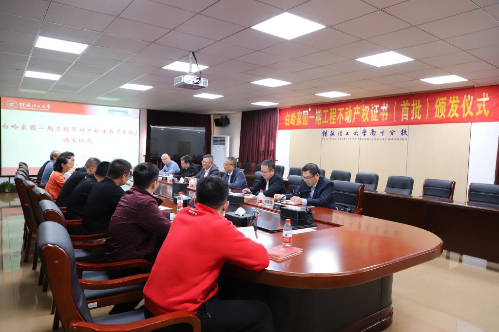 12月7日,白岭家园一期工程不动产权证书(首批)颁发仪式在beat365空港校区行政楼416会议室举行。学校党委书记邓军,党委副书记、校长王敦球,党委副书记吴志强,党委委员、校长助理张成龙出席仪式。南宁分校党委书记李雨、扶绥县不动产登记中心主任姚高作、白岭家园业主委员会代表、扶绥县奕和物业服务公司代表、白岭家园业主代表、空港校区建设指挥部、白岭家园不动产权证办理专项小组成员及南宁分校相关职能部门工作人员参加仪式。