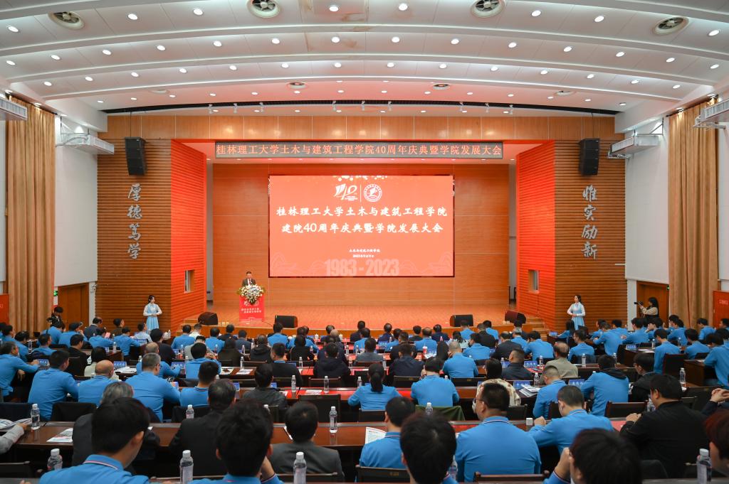 王磊在讲话中对土建学院成立40周年表示热烈祝贺,向各位校友、各位朋友的到来表示热烈欢迎,向长期以来关心支持学校、支持土建学院建设发展的广大校友和社会各界朋友表示衷心感谢和崇高敬意。他指出,从1983年创建至今,土建学院走过了40年的发展历程。四十年来,一代代土建人围绕人才培养、科技创新、社会服务接续奋斗,聚集了国家优青、国家“百千万人才工程人选”等一批优秀人才,建成了广西重大科技创新基地、广西重点实验室等一批高水平科研平台,获得了国家技术发明二等奖、广西科技进步一等奖等一批重要奖励,服务了“港珠澳大桥”“中国天眼”等一批国家重大工程和重点产业,培养了一批土木建筑类优秀人才。他表示,面对区内外日趋激烈竞争新形势,高等教育内涵式发展新要求,建设一流土建学院新目标,土建学院必须要有新作为、新发展、新突破。他希望土建学院全体师生和广大校友多为学院发展建务实之言,提务实之策,共同擘画学院发展新蓝图。学校也将继续大力支持土建学院的发展,为学院在博士点申报、一流学科建设、高层次人才队伍和高水平科研平台建设等方面给予更多关注和支持,促进学院加快发展高质量发展,以学院的强大促进学校综合实力的提升,为建设特色鲜明、国内知名高水平理工大学贡献更多智慧和力量。
