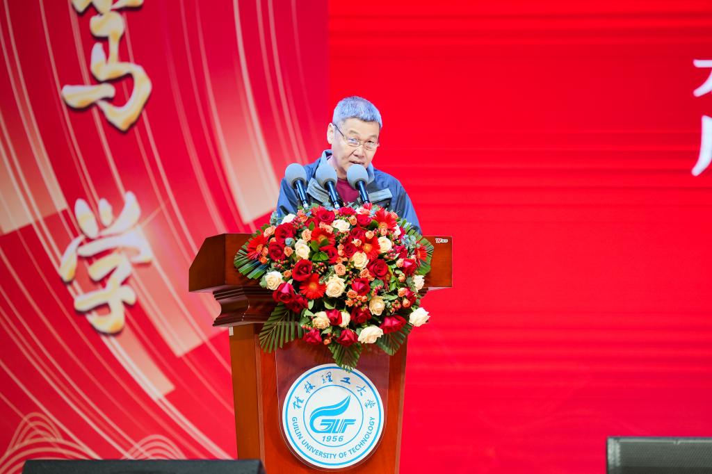 王敦球为庆典致辞。他代表学校向各位校友的到来表示热烈欢迎,向长期以来关心支持学校建设发展的各级领导、各位校友和社会各界朋友表示衷心感谢和崇高敬意。他指出,从1956年建校至今,桂工已经走过了67年的光辉历程。在一代又一代桂工人的接续奋斗下,学校发展日新月异,办学实力不断增强,社会知名度、美誉度不断提升。伴随着学校的发展,土建学院也走过了40年的发展历程。40年来,一代代土建人紧紧围绕“立德树人”根本任务,聚焦学院高质量发展、聚焦高水平理工大学建设,矢志奋斗,拼搏奉献,在人才培养、科学研究、社会服务等方面取得了一系列傲人的成绩。他表示,当前,在全校上下正奋力奔跑在建设特色鲜明、国内知名高水平理工大学的新征程上,需要一个个二级学院的勠力同心、矢志奋斗,快速发展、建大建强,更需要全体桂工人继续在人才培养中“挑大梁”、在学科建设中“担大任”、在科技创新中“扛大旗”、在服务发展中“出大力”。
