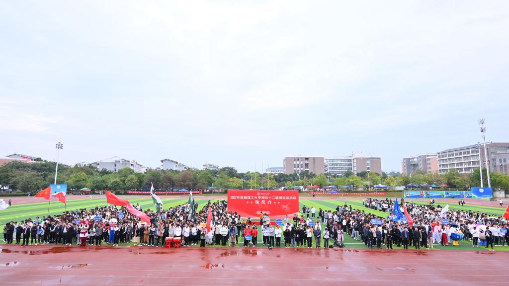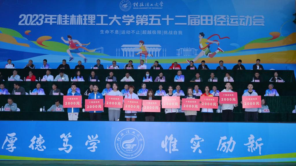 闭幕式上,本次运动会总裁判长、体育教学部主要负责人宣布了本届校运会比赛成绩。材料学院、外国语学院、管媒学院、艺术学院、化生学院、马克思主义学院荣获精神文明奖;环境学院、土建学院、商学院、旅游学院、继教学院、南宁分校荣获优秀组织奖;附小分工会、土建分工会、后勤分工会、地球分工会、机关三分工会、旅游分工会荣获教职工团体总分前六名;商学院,南宁分校、管媒学院,研究生院,外语学院,环境学院,旅游学院荣获女子甲组团体总分前六名;商学院、外语学院、化生学院、测绘学院、信息学院、土建学院荣获女子乙组团体总分前六名;南宁分校、土建学院,机控学院,研究生院,商学院,信息学院,化生学院荣获男子甲组团体总分前六名;土建学院、继教学院、材料学院、理学院、商学院、地球学院荣获男子乙组团体总分前六名;商学院,外语学院,南宁分校、管媒学院,环境学院,化生学院,土建学院荣获女子团体总分前六名;土建学院,南宁分校、商学院,理学院,材料学院,继教学院,研究生院荣获男子团体总分前六名;商学院,土建学院,南宁分校、信息学院,测绘学院,化生学院,地球学院荣获2023年度运动会团体总分前六名;环境学院周广晶同学获得第52届田径运动会破纪录奖;地球学院李杺满、土建学院樊鸿祥、化生学院梁石、土建学院项哲、环境学院周广晶、研究生院赖鹏德、艺术学院蒙晓玉、化生学院韦月萍、信息学院魏炬华、材料学院范霄萌等10位同学荣获2023年度“十佳运动员”称号。
