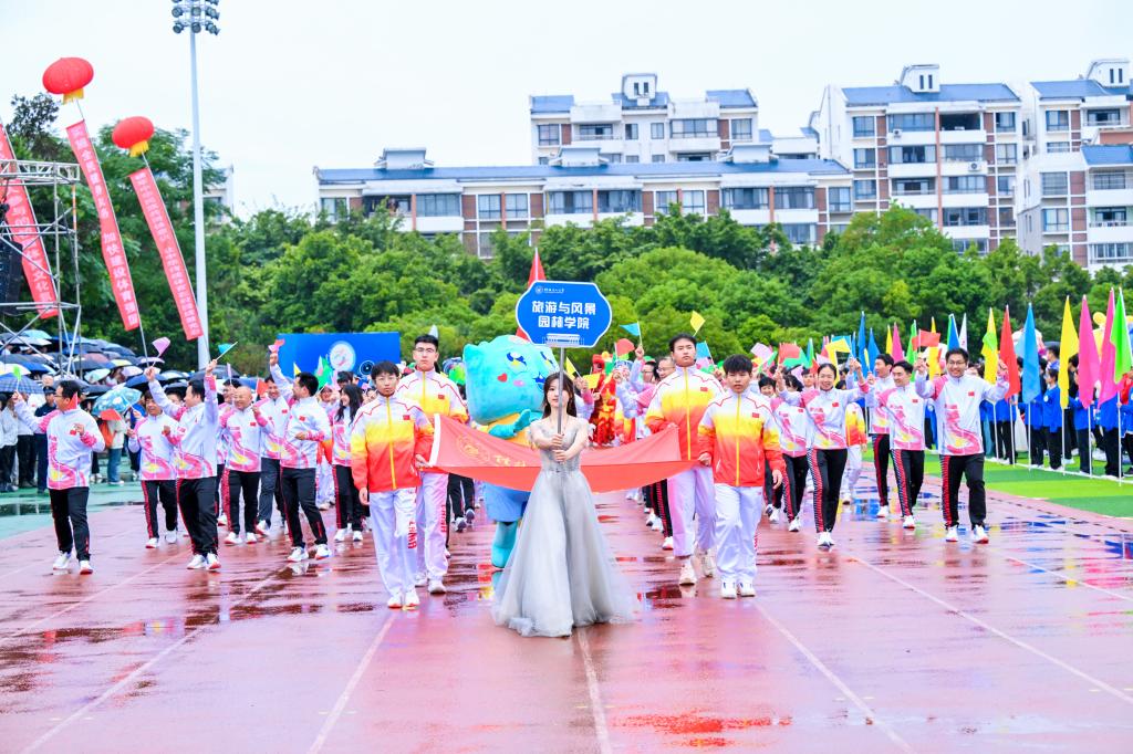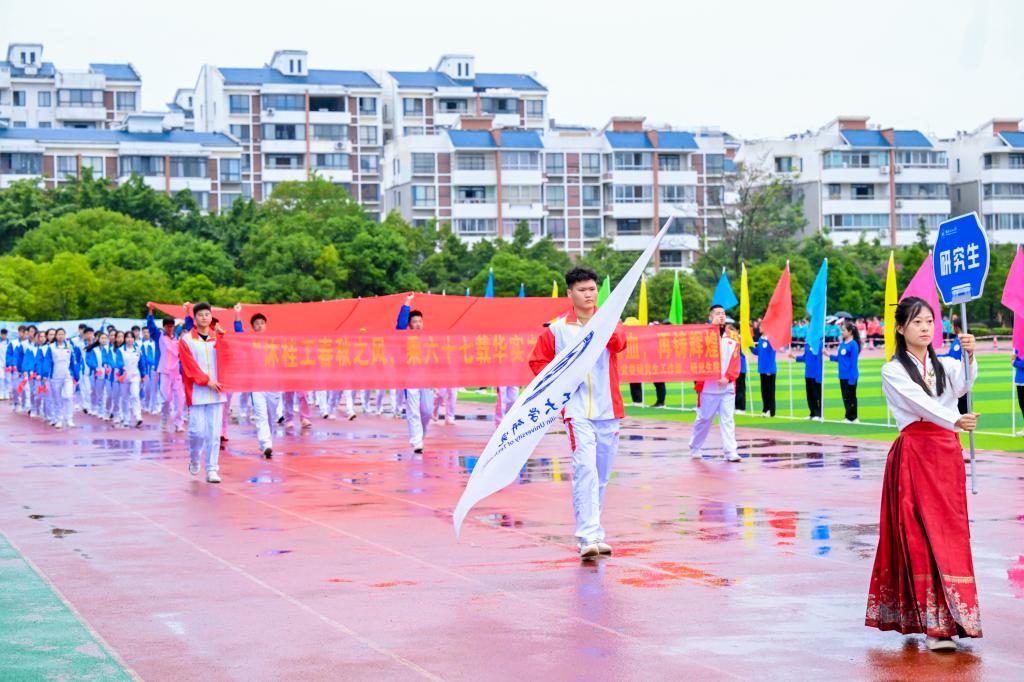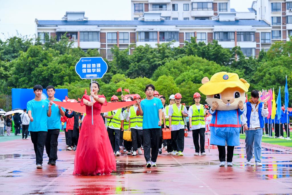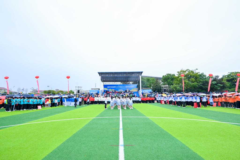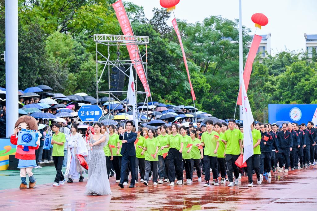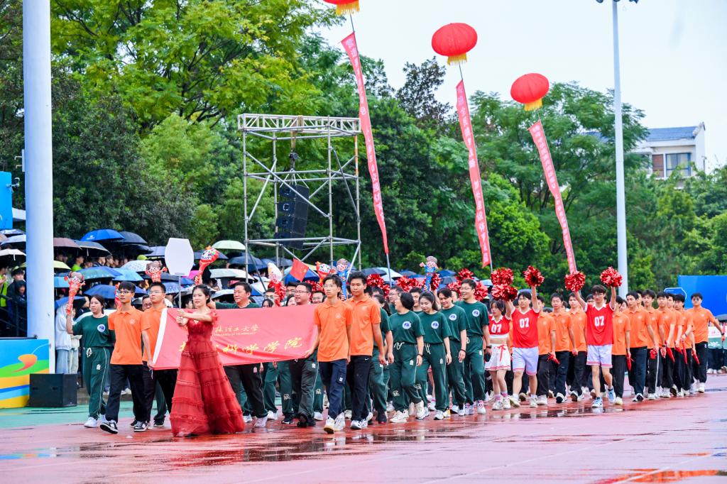 运动会在蒙蒙秋雨中拉开帷幕。伴随着激昂的运动员进行曲,国旗班方块队队员们护送鲜艳的五星红旗、校旗、校运会会旗和会徽进入会场。彩旗队、鲜花队紧随其后,队员们挥舞着手中的彩旗和鲜花,喊着嘹亮的口号,为运动员喝彩。裁判员、各分工会、各学院方阵迈着铿锵的步伐逐一入场。随后,全体人员在雄壮的中华人民共和国国歌声中举行了升旗仪式。
