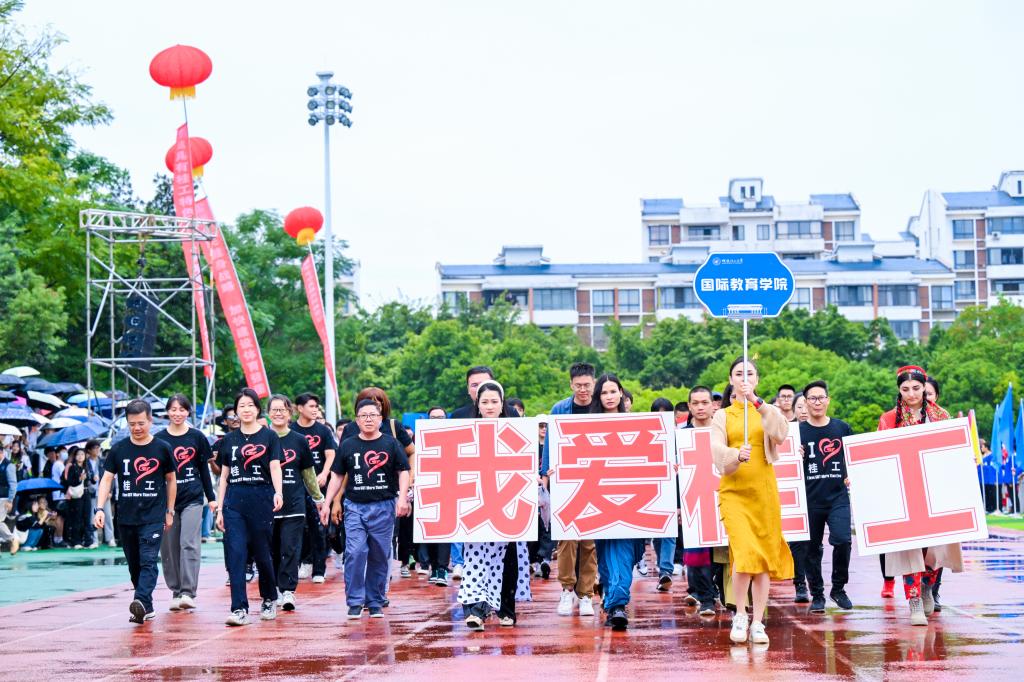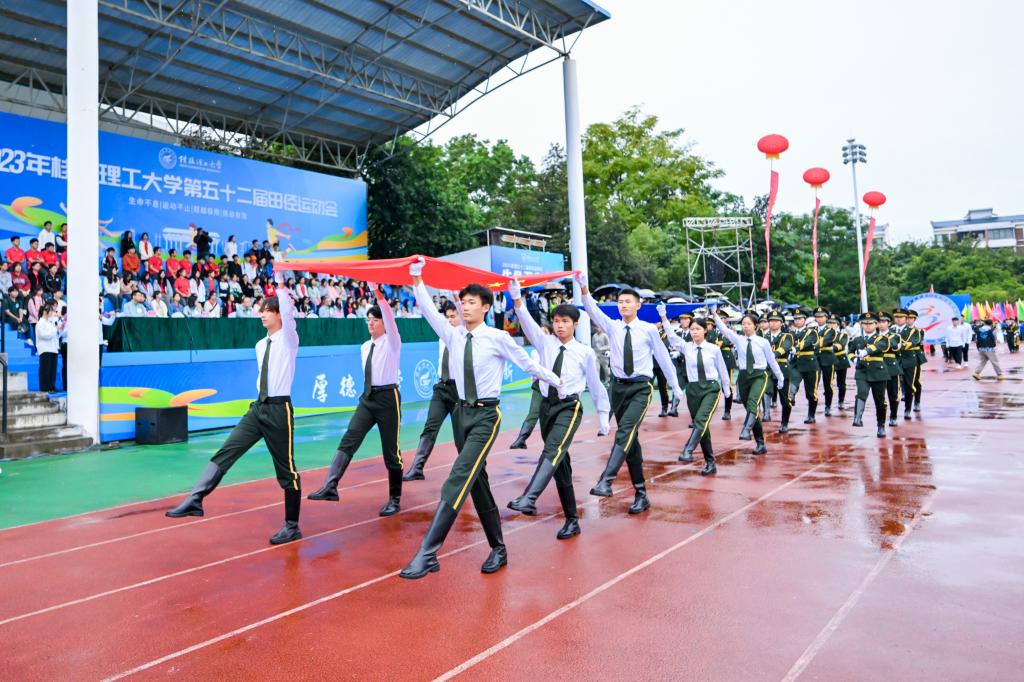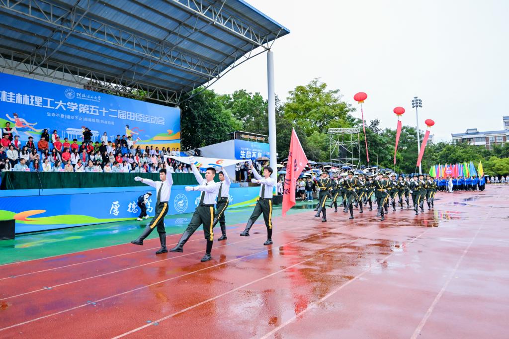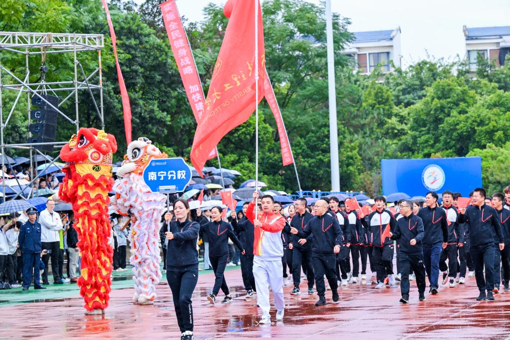 11月6日上午,beat365第52届田径运动会在雁山校区开幕。在家校领导王敦球、韦学敏、王磊、曾繁荣,党委常委唐壮东、叶昊、邱杰,校长助理张成龙、潘旦光出席开幕式。学校各单位、各部门领导班子成员,各分工会主席,各教职工、学生运动员代表队,教师代表、学生代表参加开幕式。开幕式由学校党委常委、统战部部长邱杰主持。