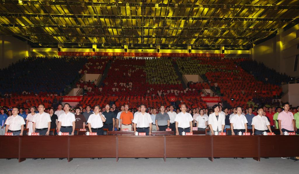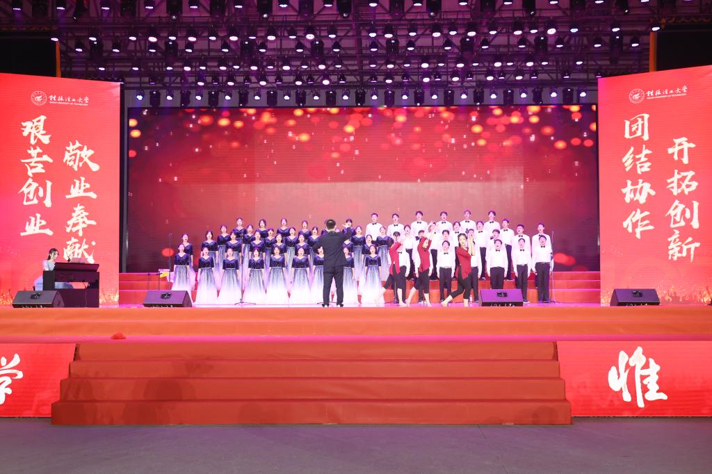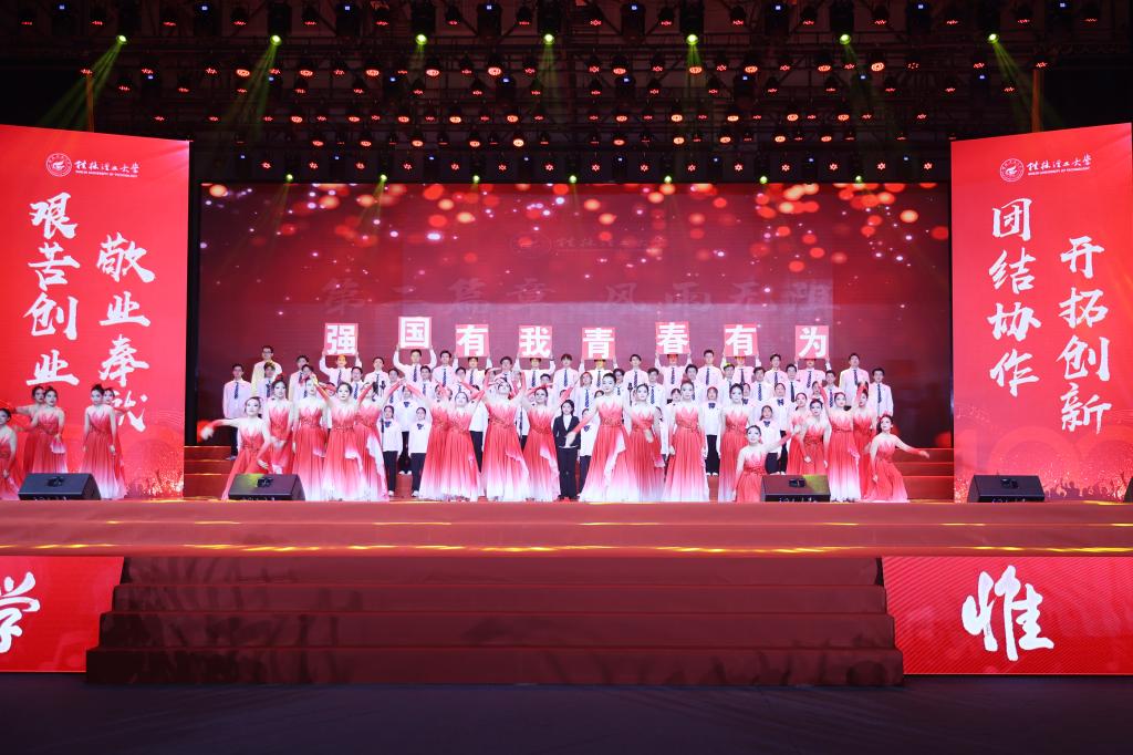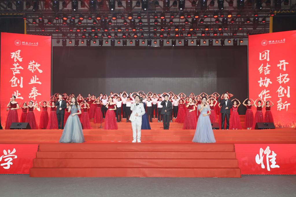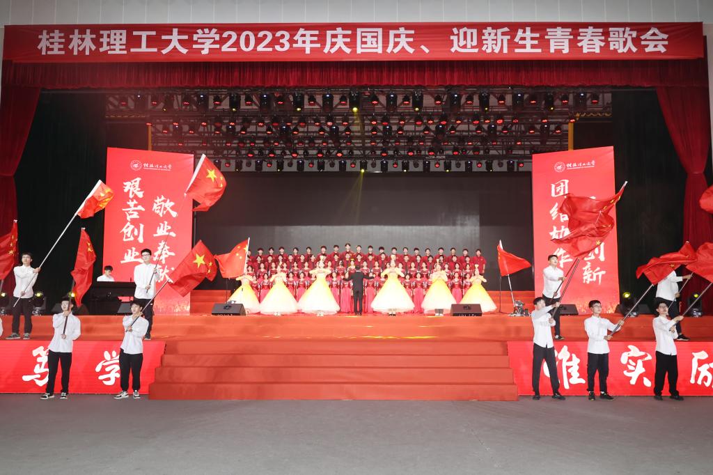 为热烈庆祝中华人民共和国成立74周年,欢迎2023级新同学的到来,9月27日晚,beat365官方网站2023年“歌声飘过一百年”庆国庆、迎新生青春歌会在雁山校区新体育馆举行。在家校领导邓军、王敦球、吴志强、王玫、韦学敏、曾繁荣,党委常委唐壮东、叶昊,校长助理张成龙出席晚会。学校相关部门、二级学院负责人、相关人员与2023级全体新生齐聚一堂,共庆佳节。