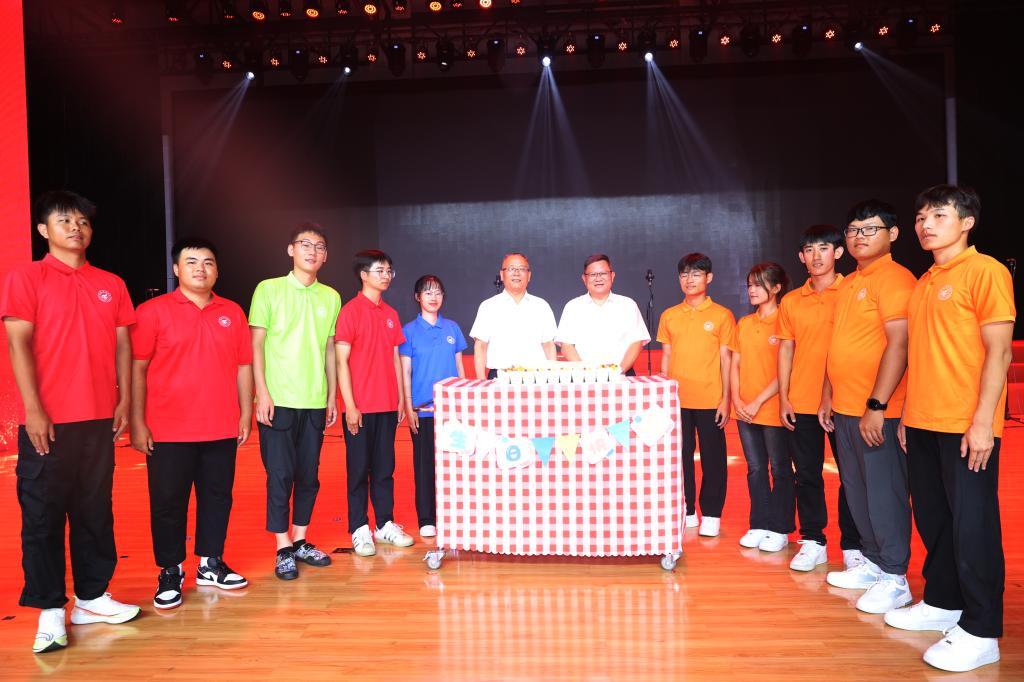 学校党委书记邓军、校长王敦球为新生代表切蛋糕、送上生日礼物和美好祝福