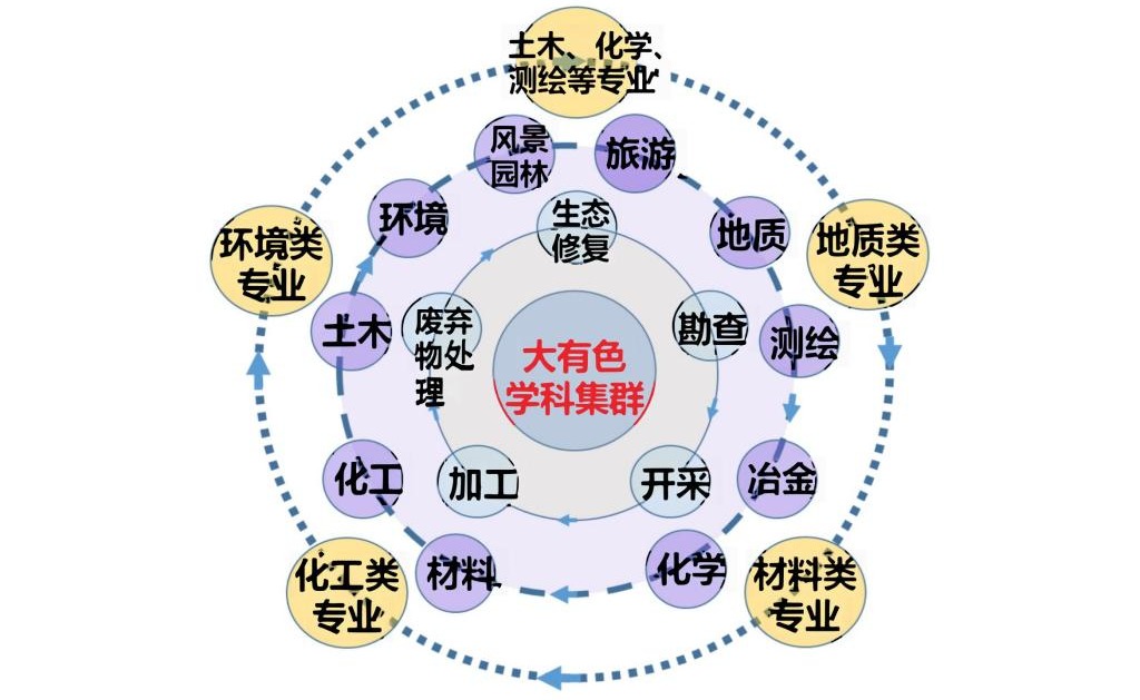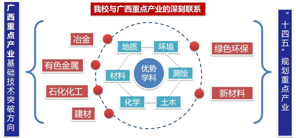 坚持目标导向,强化服务能力。学校充分利用自然资源类产业背景,加强环境、地质、材料等多个优势特色学科对接地方需求的服务能力,对接“广西特色资源(有色金属、稀土等)勘查—开采—冶炼—加工—废弃物处理—生态修复”产业链,建设“地质、环境、测绘”—“冶金、化学”—“材料、化工”—“环境、土木”—“旅游、风景园林”等学科链,推进学科集群建设,强化应用研究、成果转化、智库建设,进一步凸显学科特色。