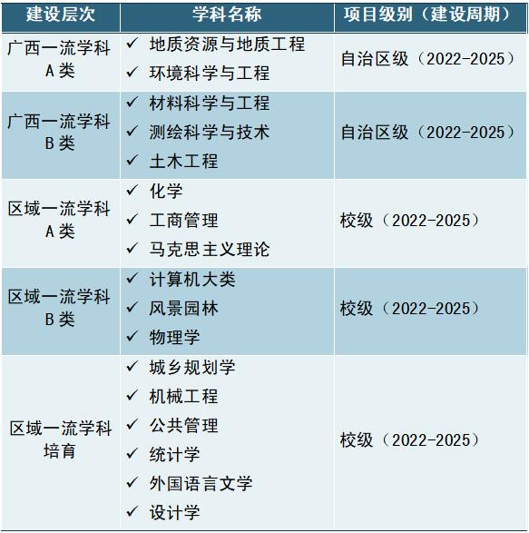 2018年,学校地质资源与地质工程、环境科学与工程、材料科学与工程、测绘科学与技术和土木工程进入首轮广西一流学科建设项目,2021年五个学科顺利通过首轮广西一流学科项目终期评估并进入第二轮项目建设,目前各学科建设项目有序推进中。