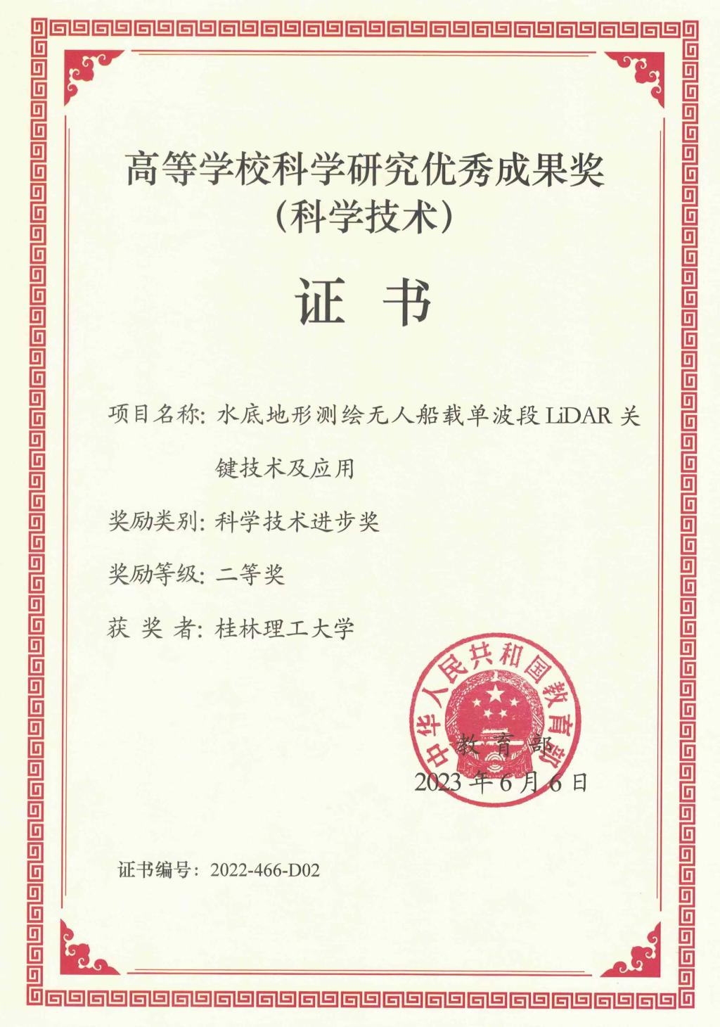 beat365周国清教授团队成果“水底地形测绘无人船载单波段LiDAR关键技术及应用”获得2022年度教育部高等学校科学研究优秀成果奖科技进步二等奖