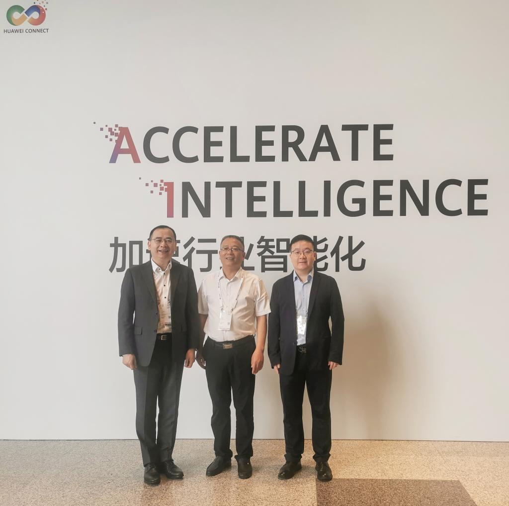 学校校长王敦球(中)与华为技术有限公司中国区教育医疗总裁卢永平(左一)、华为技术有限公司中国区教育总裁郭金亮(右一)在现场合影