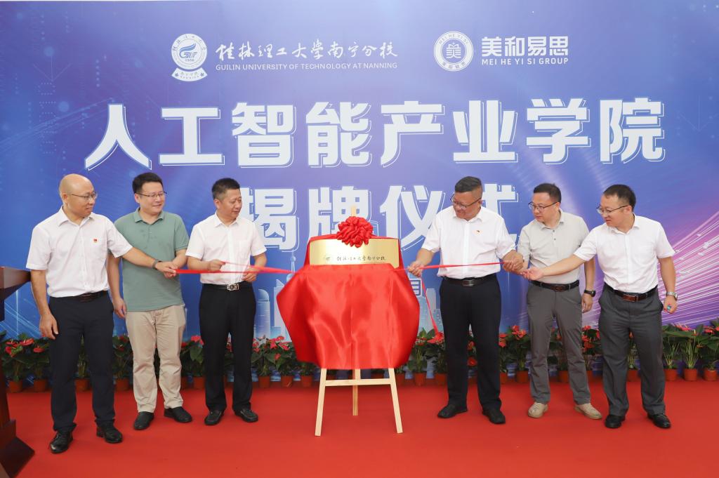 邓军在揭牌仪式上致辞。他指出,南宁分校以人工智能产业学院成立为契机,密切与武汉美和易思公司的合作,不断谱写南宁分校产教融合发展的新篇章。他希望,南宁分校积极探索“三融一基”人才培养模式,利用国内外知名企业、高等院校和科研院所的知名专家和技术平台资源,努力把人工智能产业学院建设成为“开放创新、示范引领、行业标杆”的特色产业学院;美和易思充分发挥公司在技术、资源等方面的优势,积极支持产业学院建设,着力打造教学、研发、创新创业功能于一体、产学研用协同的实验、实训实习基地,推动学校人才培养、科技创新供给侧与产业需求侧紧密对接,推动企业和学校共赢发展,携手为数字中国建设贡献更多的智慧和力量。