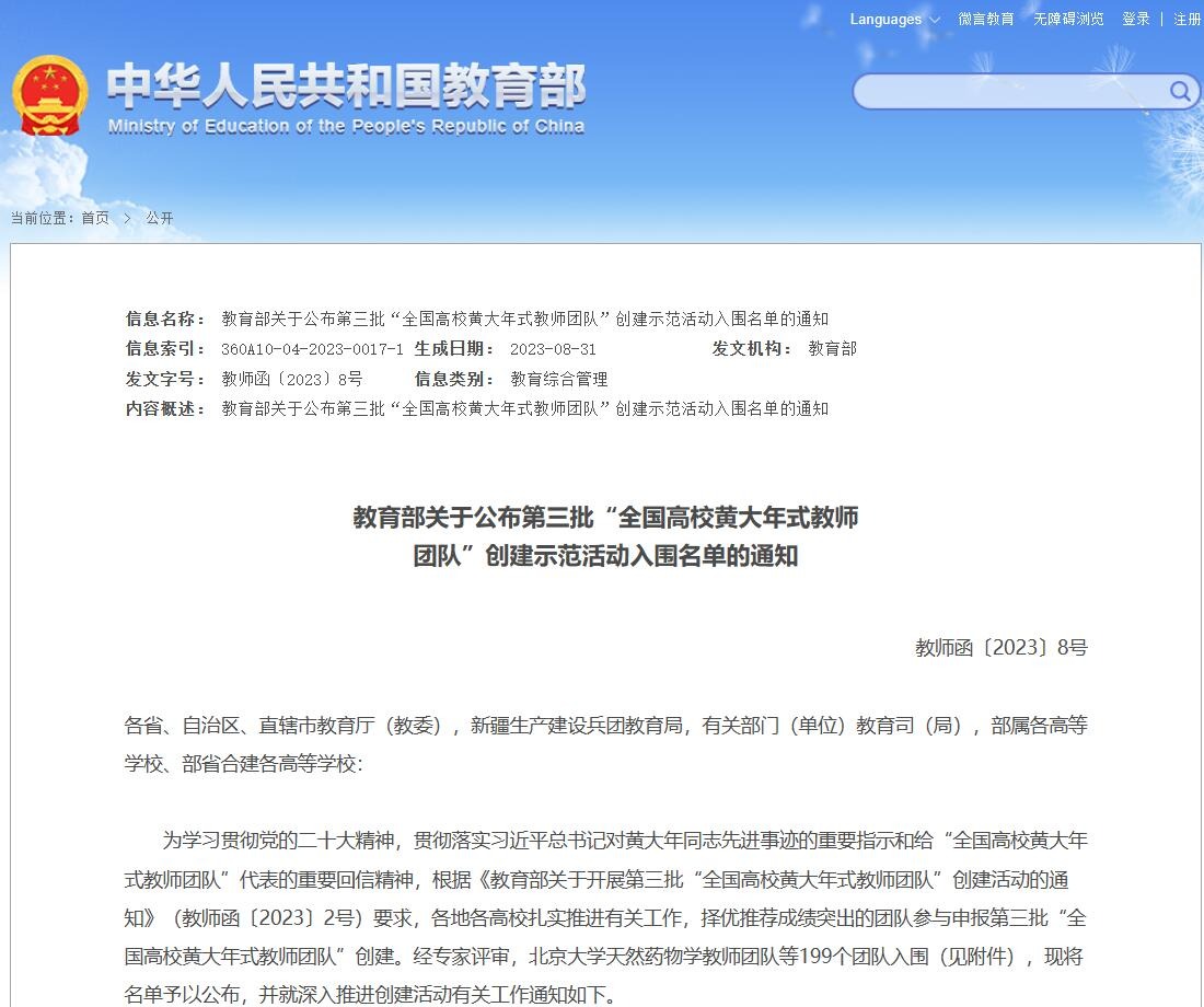 “全国高校黄大年式教师团队”是教育部为深入学习贯彻党的二十大精神,全面贯彻落实习近平总书记对黄大年同志先进事迹重要指示精神,推进高素质专业化创新型高校教师队伍建设,在全国开展的创建工作。今年是第三批创建示范活动,经过专家层层评审,全国一共199个团队入选。