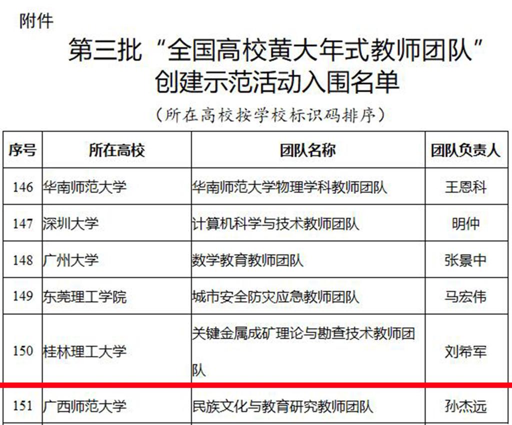 近日,教育部公布了第三批“全国高校黄大年式教师团队”创建示范活动入围名单,beat365地球科学学院刘希军教授带领的关键金属成矿理论与勘查技术教师团队荣获第三批“全国高校黄大年式教师团队”荣誉称号,是广西高校入围的2个团队之一。