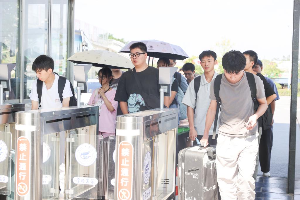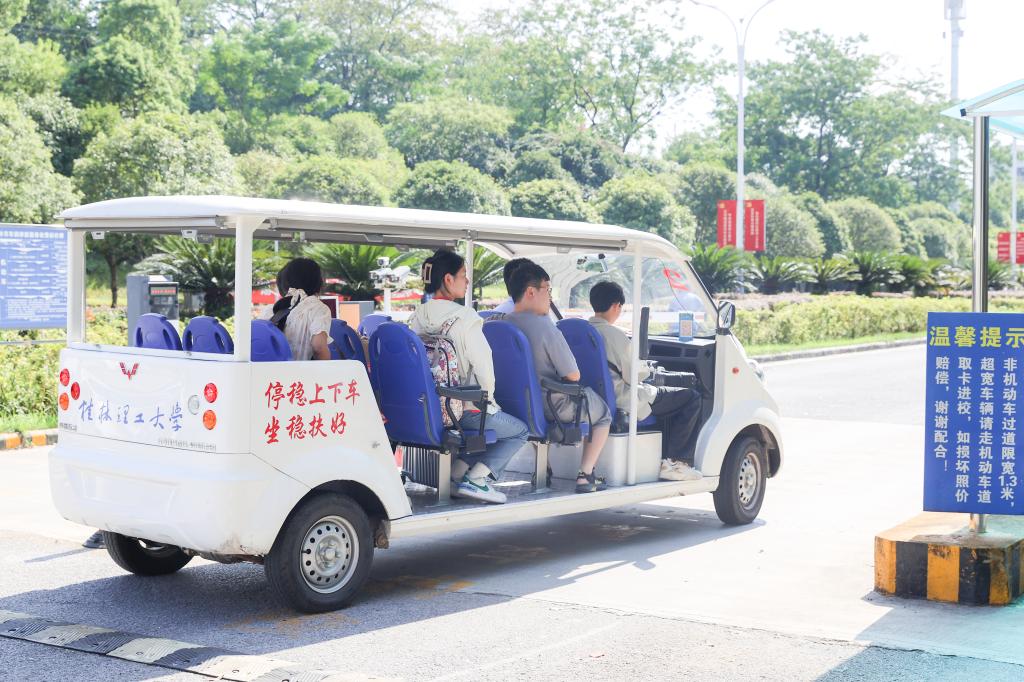 校门口,一辆辆“定制公交”、“舱门到校门”专线满载学生安全、顺利、快捷抵达;保卫处工作人员坚守岗位,及时疏导人流和车辆;同学们有序排队刷脸入校,接驳车打通暖心服务“最后一公里”。
