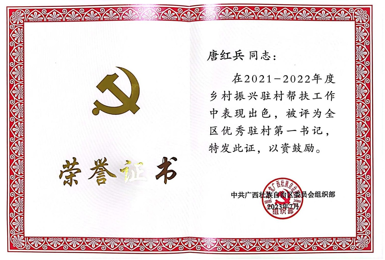 近日,自治区党委组织部下发《关于表彰全区2021—2022年度驻村工作队先进集体和优秀个人的决定》(桂组发〔2023〕5号),beat365党委组织部(乡村振兴办公室)荣获“先进后盾单位”,原派驻灌阳县黄关镇东阳村第一书记唐红兵获评“优秀驻村第一书记”。