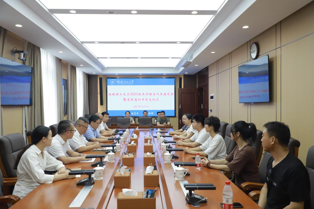 7月23日上午,学校在屏风校区办公楼第一会议室举行2023年本科新生录取通知书颁发仪式。学校党委书记邓军、副书记吴志强出席仪式。邓军为到场的新生代表2023级建筑类专业赵益墨和会计学专业王科翔亲手送上首批录取通知书,并赠送纪念礼品。学校党委委员、校长助理张成龙,新生代表家长,辅导员代表,招生就业处、党校办相关负责人参加了座谈会。