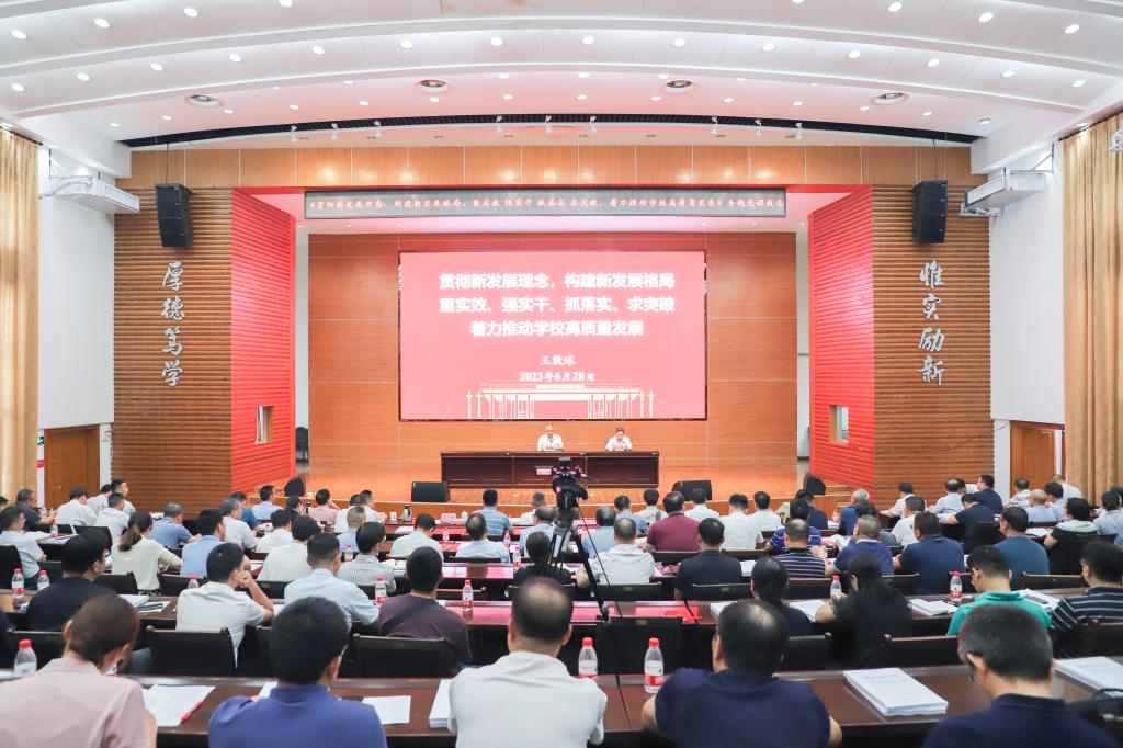 会上,王敦球以《贯彻新发展理念 构建新发展格局 重实效强实干抓落实求突破 着力推动学校高质量发展》为题,围绕“深刻领会新发展理念的科学内涵,完整准确全面贯彻新发展理念”“准确把握构建新发展格局的着力点,主动融入新发展格局”“旗帜鲜明重实效强实干抓落实求突破,全力推动学校高质量发展”等方面,站在学校发展全局和战略的高度,深刻分析了学校当前发展所面临的挑战和机遇,从内外部两个角度阐释了如何准确把握构建新发展格局的着力点,并聚焦“干什么”“怎么干”“干得怎么样”等三个问题对推动学校高质量发展进行了详细阐述和全面部署。