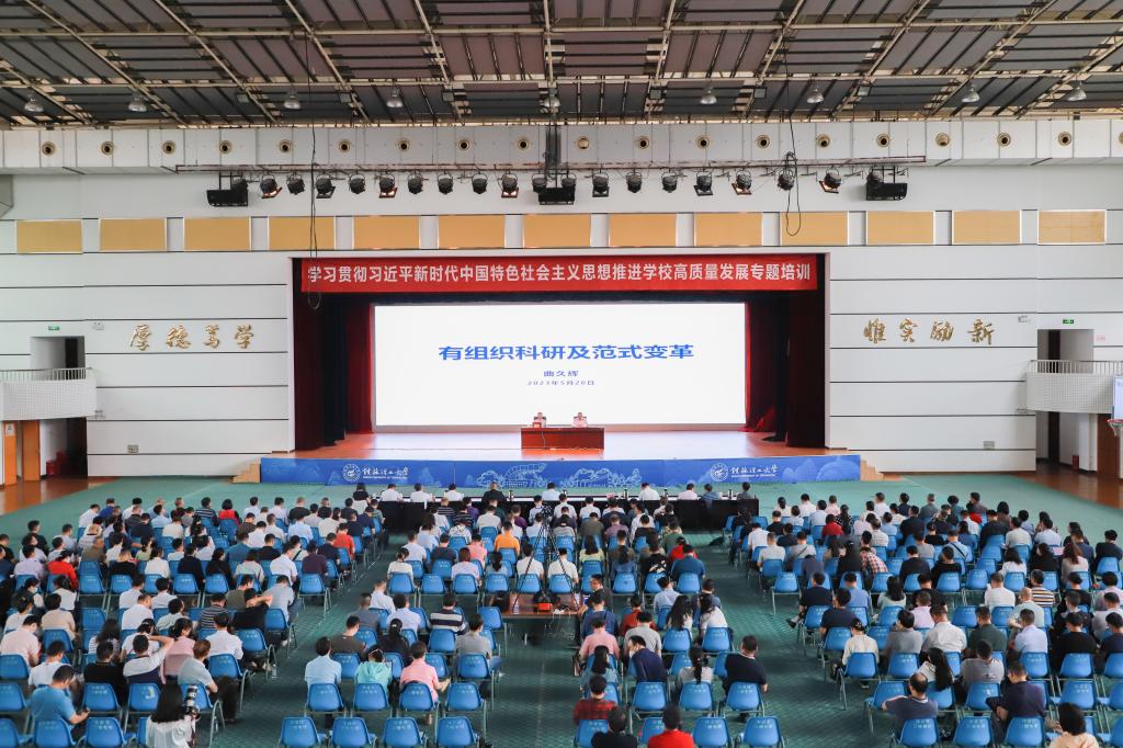 为深入学习贯彻习近平新时代中国特色社会主义思想和党的二十大精神,切实推动学校加快发展高质量发展,5月26日上午,学校在屏风校区体育馆三楼举办“学习贯彻习近平新时代中国特色社会主义思想 推进学校高质量发展”专题培训。beat365名誉校长、中国工程院院士、发展中国家科学院院士、美国国家工程院外籍院士曲久辉受邀到场作专题报告。在家校领导邓军、王敦球、吴志强、周国清、韦学敏、曾繁荣,党委常委唐壮东、叶昊、邱杰,党委委员、校长助理辛立章等出席报告会。会议由学校校长王敦球主持。学校处级、科级干部,教研室及实验室主任、副主任到场聆听。