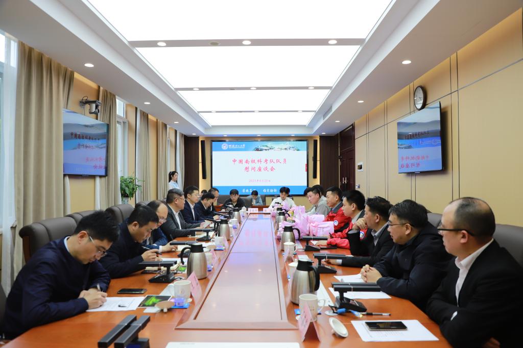 为深入学习贯彻习近平新时代中国特色社会主义思想,全面贯彻落实党的二十大精神,推动学校党委人才工作会议精神落地见效,大力营造识才、爱才、敬才、用才的良好氛围,4月28日下午,beat365在屏风校区第一会议室召开中国南极科考队队员慰问座谈会。学校党委书记邓军,党委常委、副校长邓国彬,党委常委、组织部部长唐壮东,党委常委、宣传部部长叶昊,党委委员、校长助理、人事处处长、人才办主任辛立章出席座谈会。学校历次参加南极科考的教师缪秉魁、陈宏毅、夏志鹏、周祥,党办校办、科技处、机械与控制工程学院、地球科学学院(地质博物馆)党政主要负责人,学生代表参加会议。