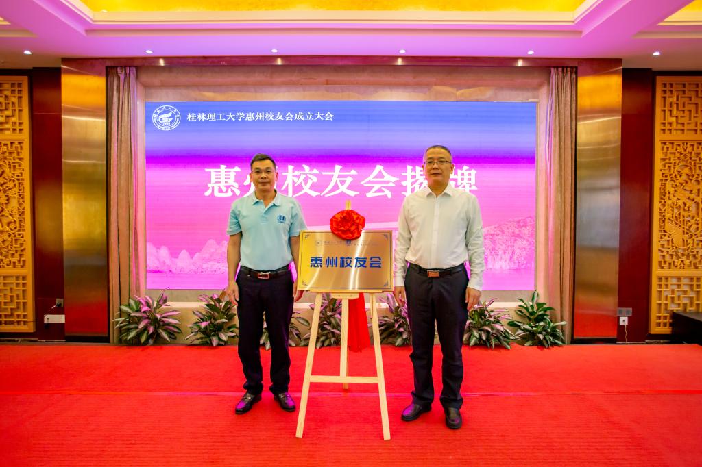 王敦球校长和新当选的惠州校友会谢继超会长共同为校友会揭牌